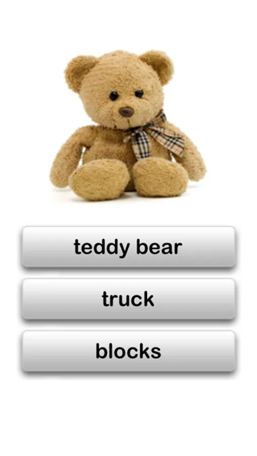 - Labels of all photos with the option to turn off the label as some children with Autism may be more drawn to the written word. At the end of eight images there will be an option to try again, aiding in repetition and drill required for learning new words.