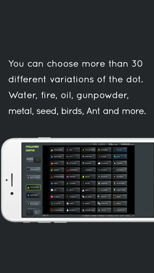 You can choose more than 30 different variations of the dot. Water, fire, oil, gunpowder, metal, seed, birds, Ant and more.