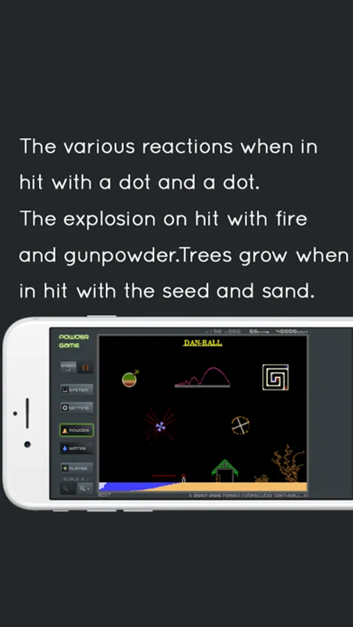 The various reactions when in hit with a dot and a dot. The explosion on hit with fire and gunpowder. Trees grow when in hit with the seed and sand.
