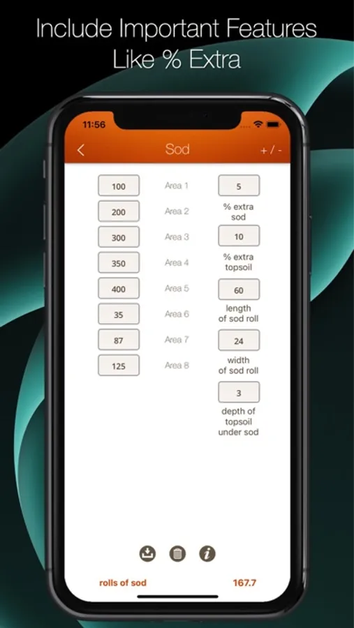 * Allows user to input unique (custom) size of roll of sod (if required)