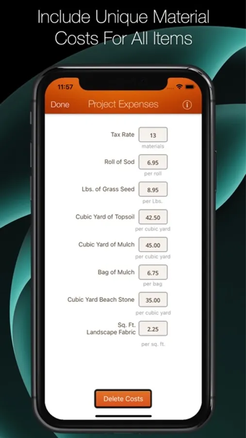 * Allows user to input material costs associated with sod, seed, topsoil and mulch