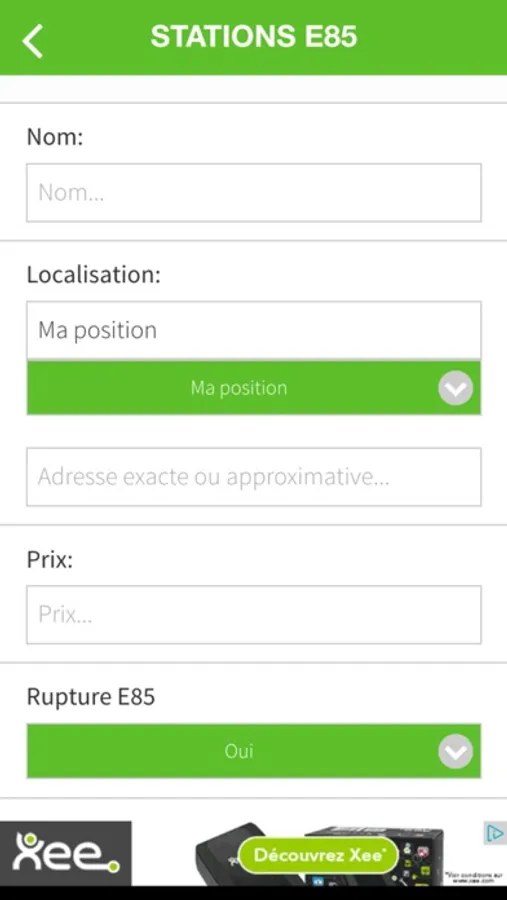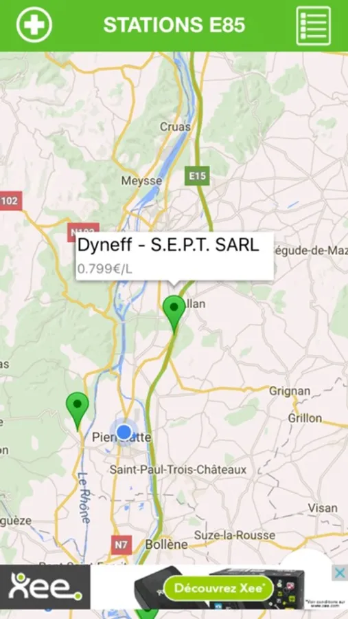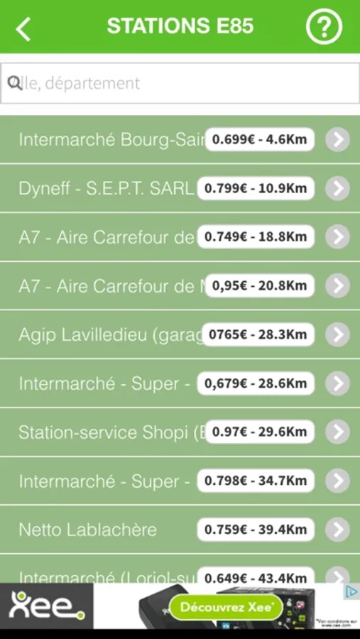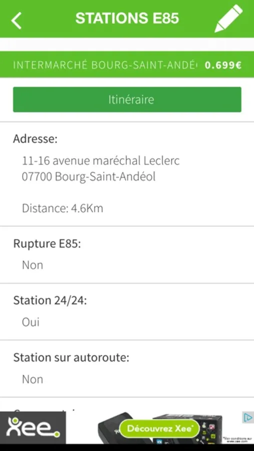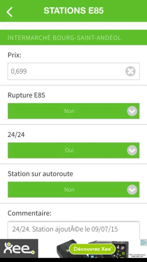 Information about the services associated with a station: CC, 24/24, motorway station, and real-time prices maintained through a community of users.