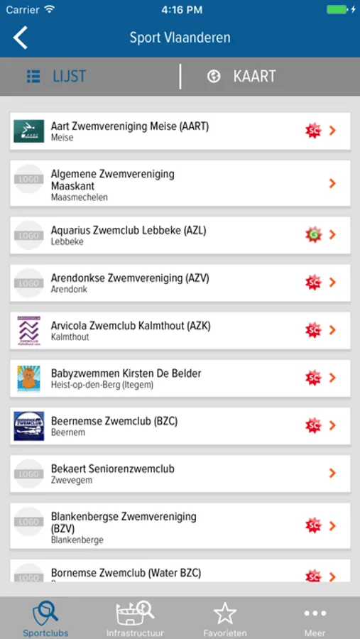 * Lijsten van sportclubs of sportaccommodaties die overeenkomen met je zoekcriteria