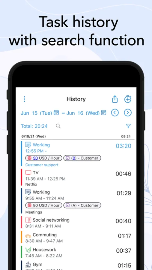 • Customization of activities with hundreds of unique icons to choose from. You can also color code the activities for a personalized time tracking experience.