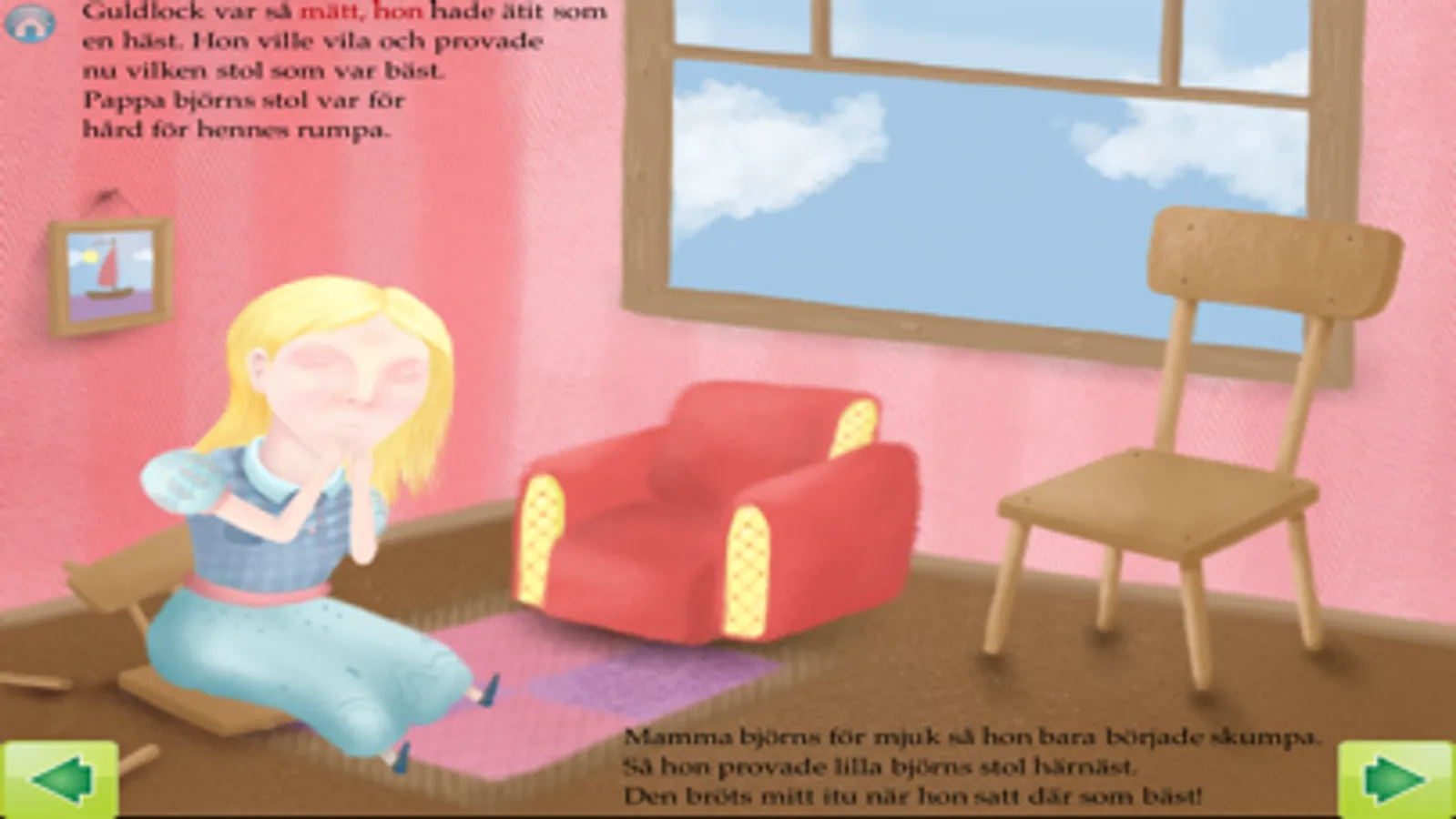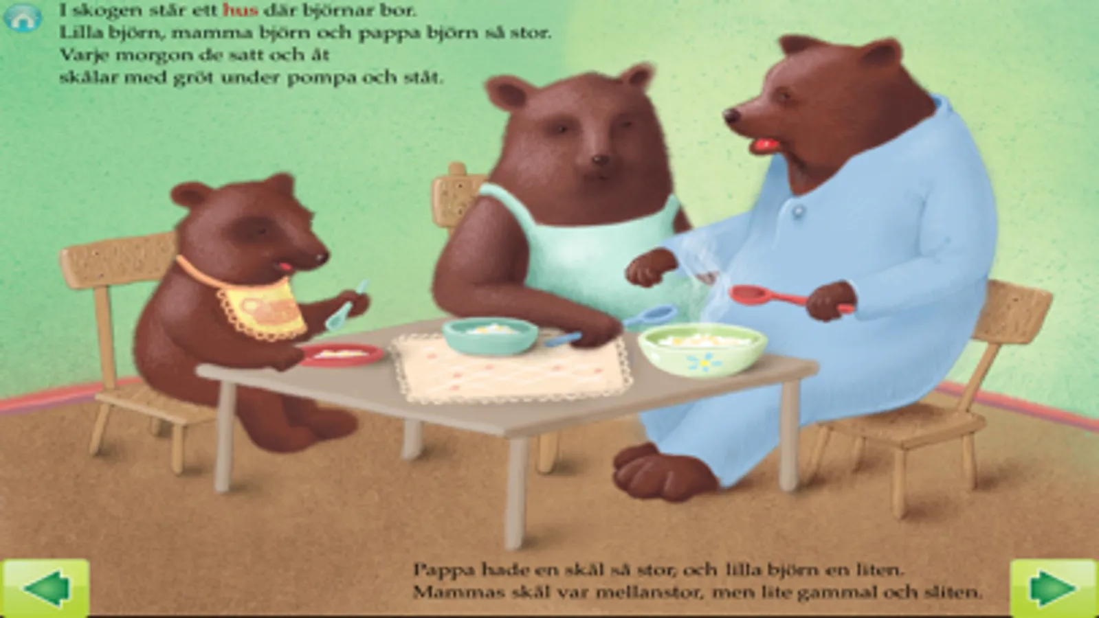 Visad i kristallklar HD-upplösning, särskilt anpassad för surfplattor, berättas sagan om Guldlock och de tre björnarna i 15 interaktiva sidor fulla med skoj.