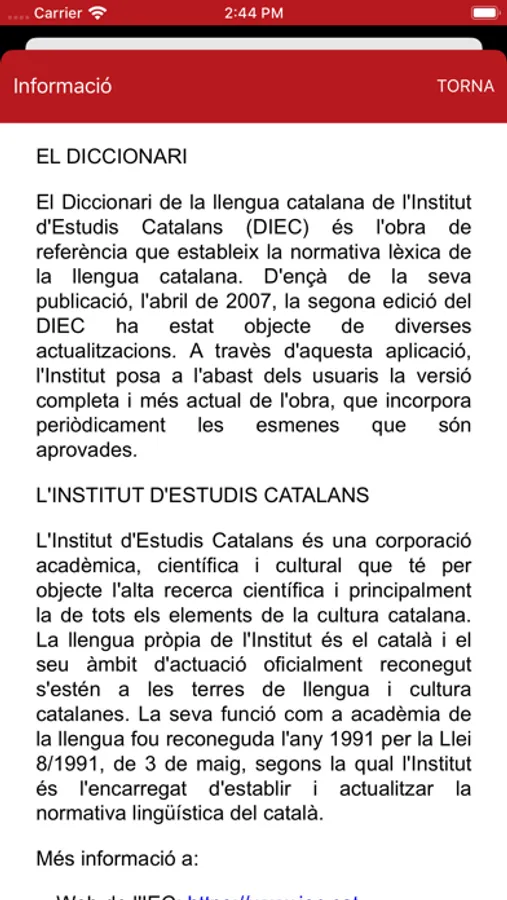 El Diccionari de la llengua catalana de l’Institut d’Estudis Catalans (DIEC) és l’obra de referència que estableix la normativa lèxica de la llengua catalana. D’ençà de la seva publicació, l’abril de 2007, la segona edició del DIEC ha estat objecte de diverses actualitzacions. A través d’aquesta aplicació, l’Institut posa a l’abast dels usuaris la versió completa i més actual de l’obra, que incorpora periòdicament les esmenes que són aprovades.