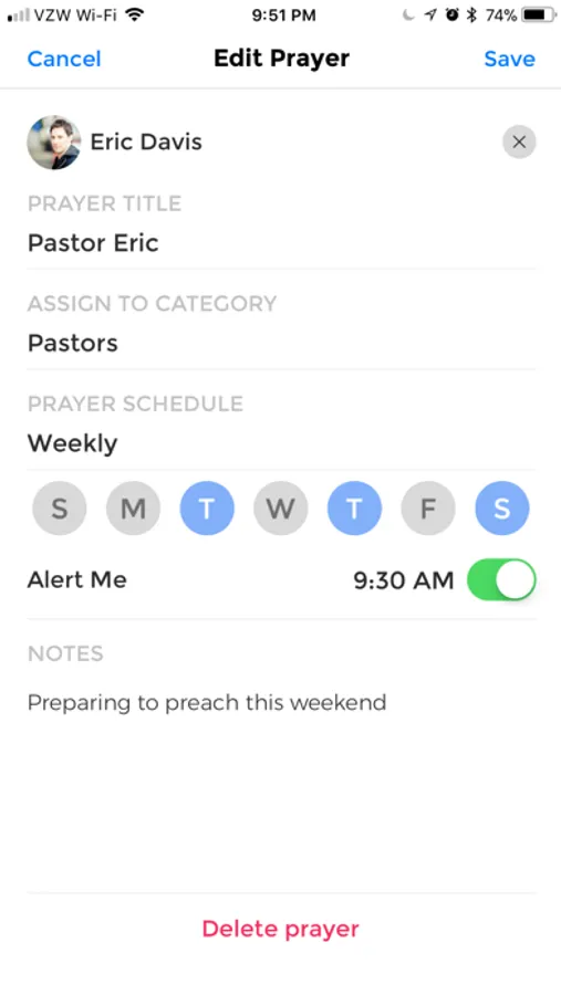 • Assign a contact to your prayer