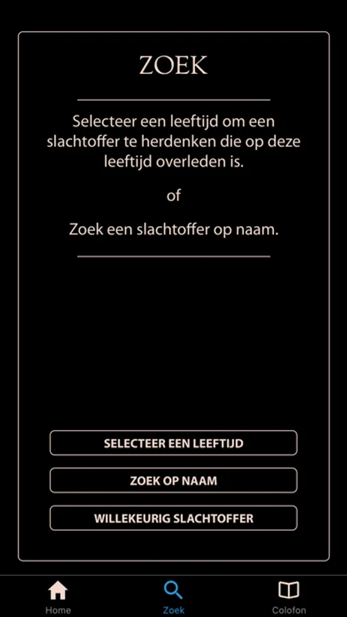 De ruim 180.000 oorlogsslachtoffers zijn van alle leeftijden. Het oudste slachtoffer is 102, het jongste 0 jaar. Met deze app kun je een leeftijd selecteren, waarna een slachtoffer wordt gezocht dat bij overlijden zo oud was. Daarna kun je hem of haar één minuut herdenken. Dat kan met je ogen dicht: je telefoon gaat aan het begin en na afloop van die minuut heel eventjes trillen.