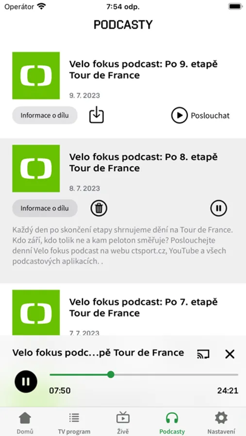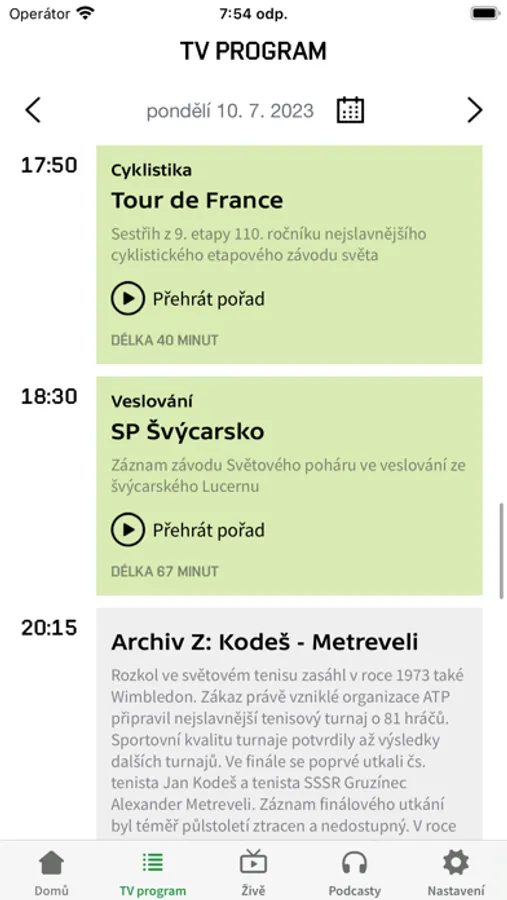 - Upozornění na nadcházející pořady kanálu ČT sport nebo jejich sledování z archivu dle televizního programu.