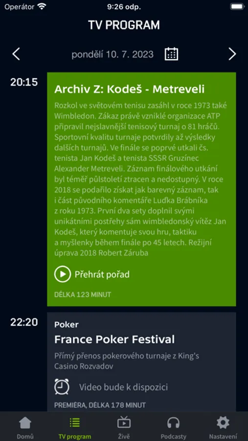Poznámka: Vzhledem k licenčním podmínkám majitelů práv nemusí být některé přenosy dostupné mimo území ČR.