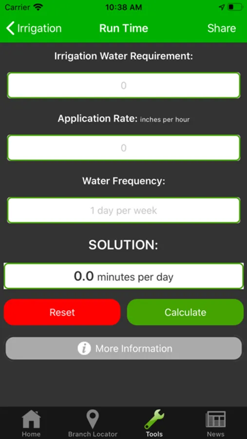 Access common formulas and conversions for drip irrigation, sprinkler systems, lighting and fertilizer applications. Use these calculators and conversion tables for quick results in the field. Share the results with a coworker or client by using the included text or email buttons.