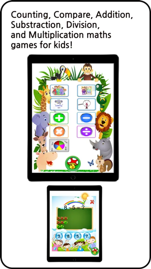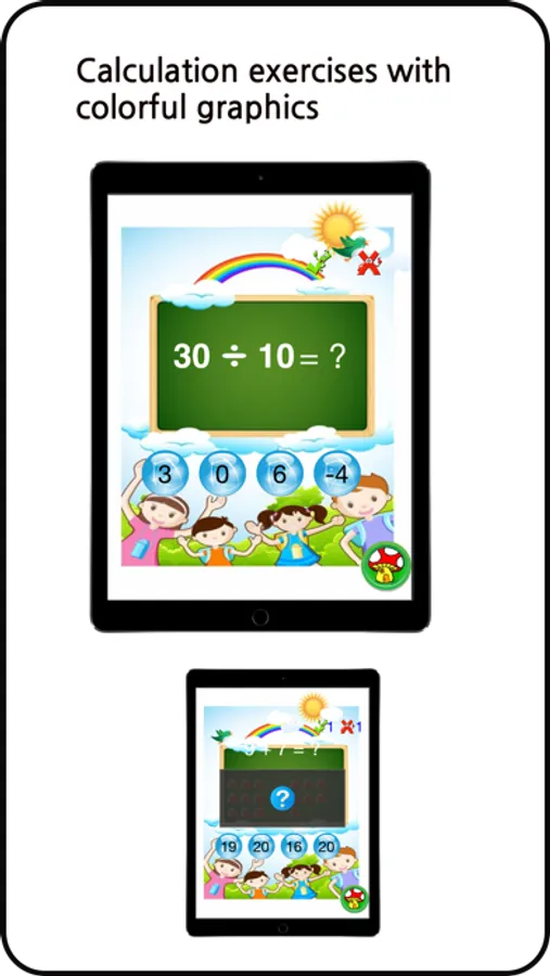 - Calculation exercises with colorful graphics: kids will soon master basic math skills of addition, subtraction, multiplication and division through exercises