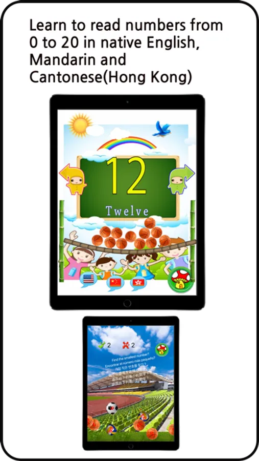 The words and numbers in the game are all recorded by native speakers in three widely spoken languages: English, Mandarin and Cantonese (Hong Kong). Young children can learn Basic Maths Skill in a fun way.