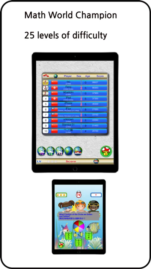 -Math World Champion: In this mode you race online against other students from around the world. The total score is summed up by your highest score in each level. The app has a total of 25 levels of difficulty.