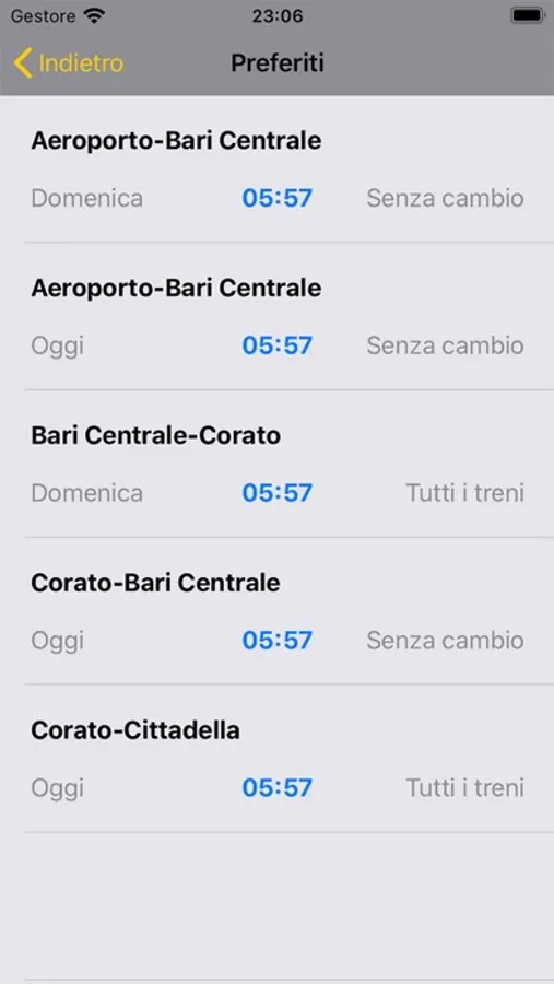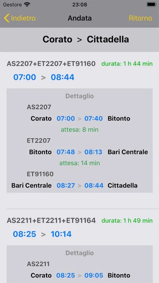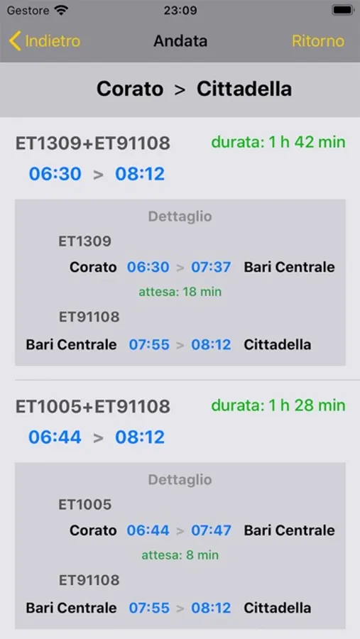 - Possibilità di richiedere gli orari dei treni diretti oppure delle combinazioni con altri treni o altra linea, con conseguente cambio in una stazione intermedia
