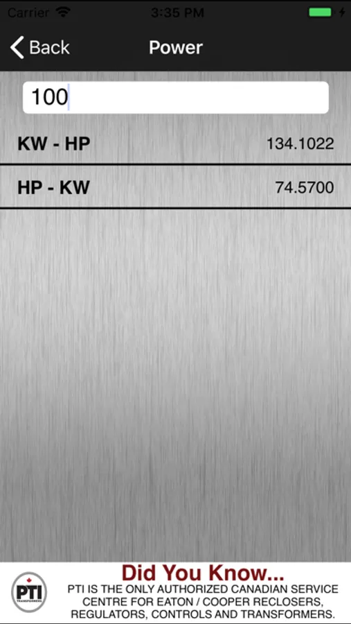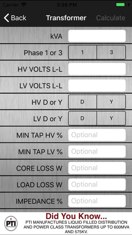 PTI "Transform"er calculates electrical transformer current, phase voltage, efficiency & regulation at various loads and power factors and provides SI/Metric conversions for Speed, Force, Power, Area, Pressure, Volume, Temperature, Weights & Measures. A handy calculator for determining ship date from any date using weeks after order (ARO) is also included. Interesting facts about PTI and what we do appear as you navigate through the application.