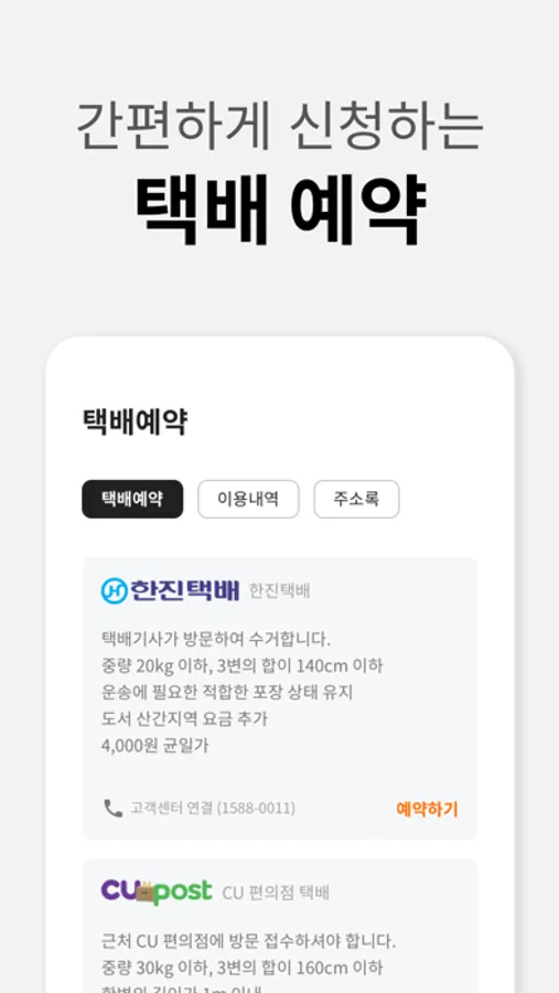 4) 택배예약 : 한진택배와 CU편의점 택배 예약 을 할수 있어요.