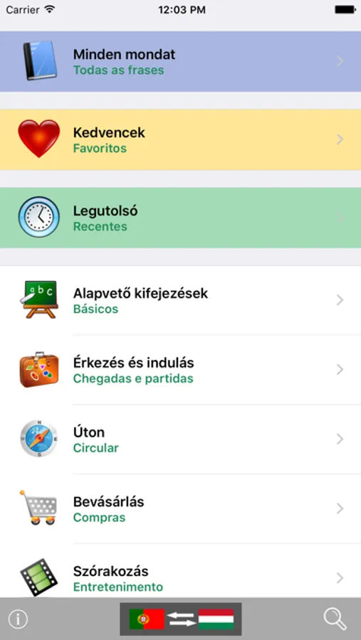 Thanks to the multiplicity of its lexicon, the Hungarian to Portuguese phrasebook and translator is really indispensable for a traveller: the included phrases have been specifically selected for tourism and for short - middle term stays. The interface has been designed to be easily readable: the translated phrase is highlighted in red, so all you have to do in order to communicate is to show the screen of your device, and you will be understood in no time!