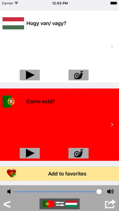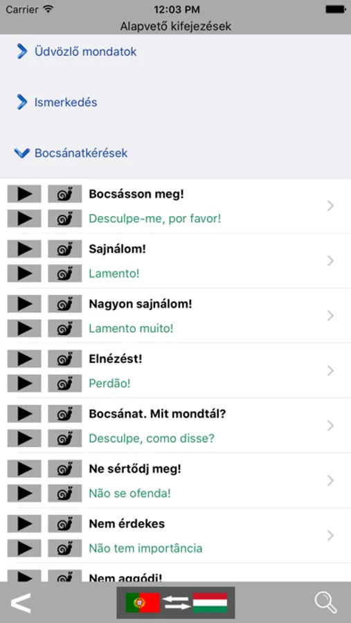 The Hungarian to Portuguese phrasebook and translator is also useful for language learning / improvement: you can save the phrases in a favorites section for easy access, and use them later to train yourself with the pronunciation.