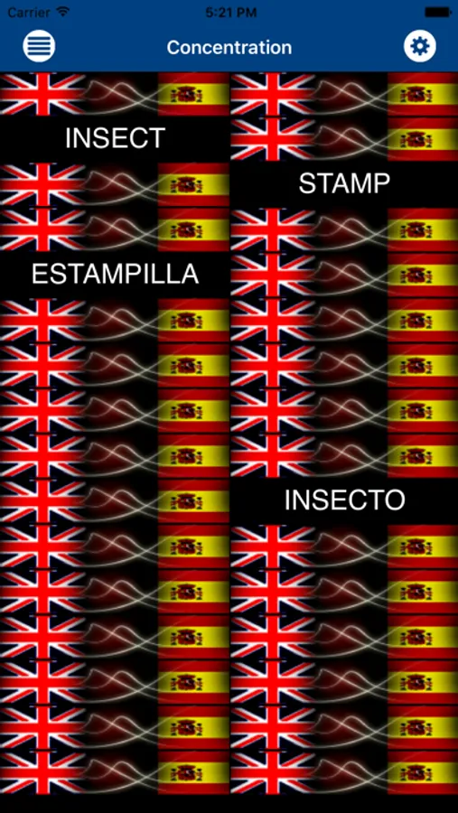 The object of the game is to turn over pairs of matching cards. A matching pair is one where an English word matches a corresponding Spanish word. When a matched pair is selected both cards remain turned over.