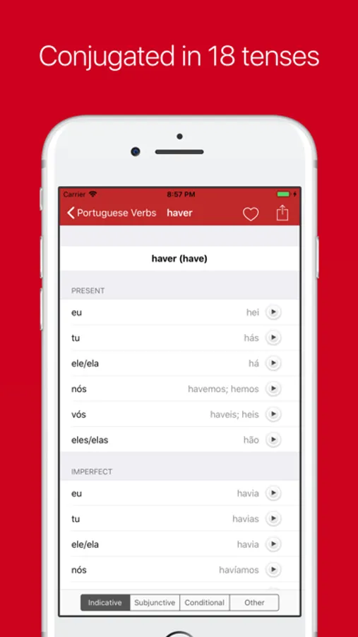 Now with audio!! Not sure how to pronounce a verb? You can now hear how every verb is pronounced. Just tap on the button next to the conjugation. Note: this functionality requires an Internet connection.