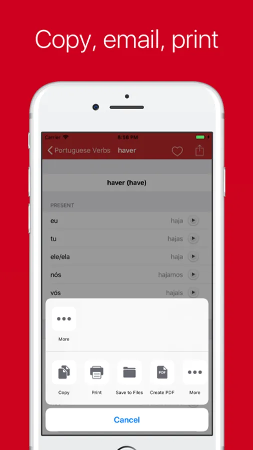 ● Export - can now export to other apps (e.g. send to Dropbox). Includes the ability to copy, email and print verb conjugations.