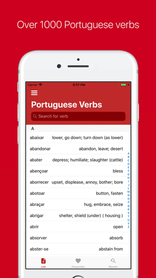 View over 700 Portuguese verbs in 18 tenses. With simple navigation and built in search, you can find the verb you need in seconds.