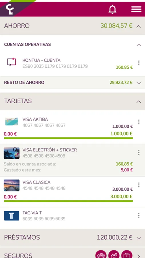 Egin kontsultak eta eragiketak zure kontuekin: Kontuaren xehetasunak, kontsultatu mugimenduak, intsuldaketak, transferentziak...