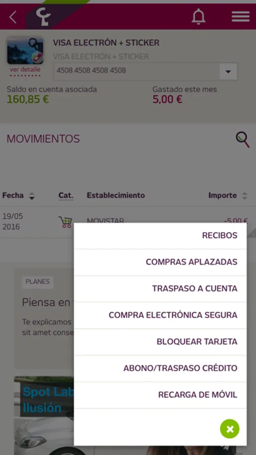 Realizar consultas y operaciones con tus tarjetas: Consulta de Movimientos Online y detalle de cada movimiento localizando en el mapa el lugar donde has realizado tus compras , consulta de extracto de tarjeta, detalle de tarjeta, solicitar nueva tarjeta, solicitar Stiker, personalizar tarjeta, aumentar el disponible de la tarjeta, traspasar crédito a cuenta, aplazar compra, bloqueo de tarjeta…