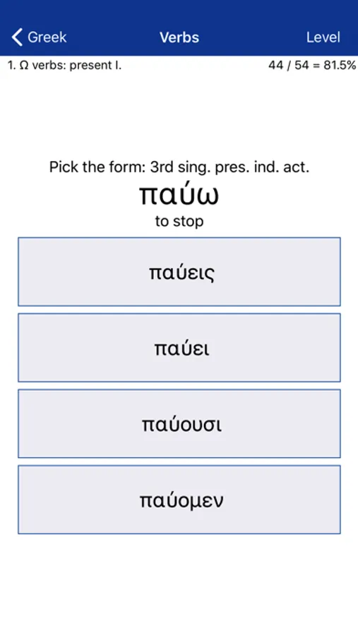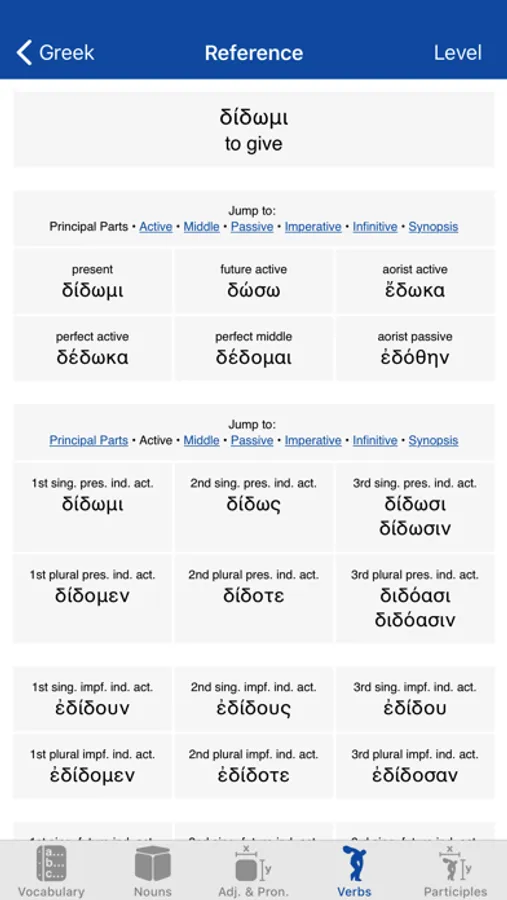 • Verbs: Tests your ability to parse and conjugate a range of paradigmatic Ancient Greek verbs.