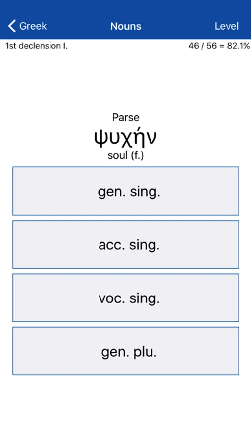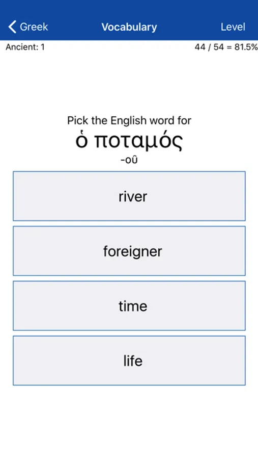 • Vocabulary: 110 levels, each testing the translation of 10 words between English and Ancient Greek. Additional sections contain 220 levels of Homeric, 210 levels of New Testament vocabulary, and 110 levels based on Plato’s Apology. Interspersed among these are cumulative levels reviewing what has been learned earlier (giving a total of 733 levels).