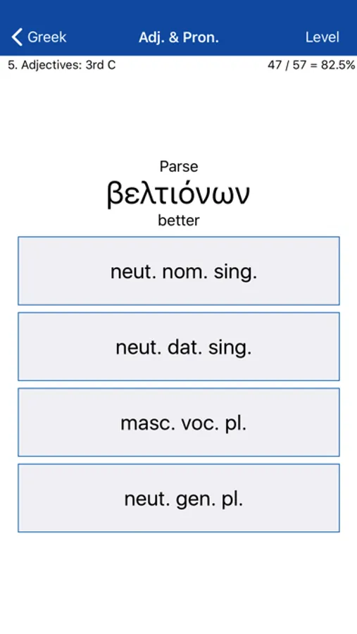 • Adjectives & Pronouns: Tests your ability to parse and decline all classes of Ancient Greek adjectives & demonstrative pronouns.