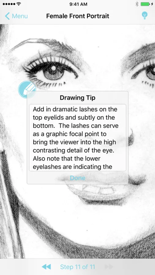Explore the creation of beautiful illustrations at your own fingertips! Each drawing tutorial is broken into 11 steps to break down each stage of the drawing process. Within each step there are additional tips that you can tap to learn more specific techniques of illustrating dazzling portraits.