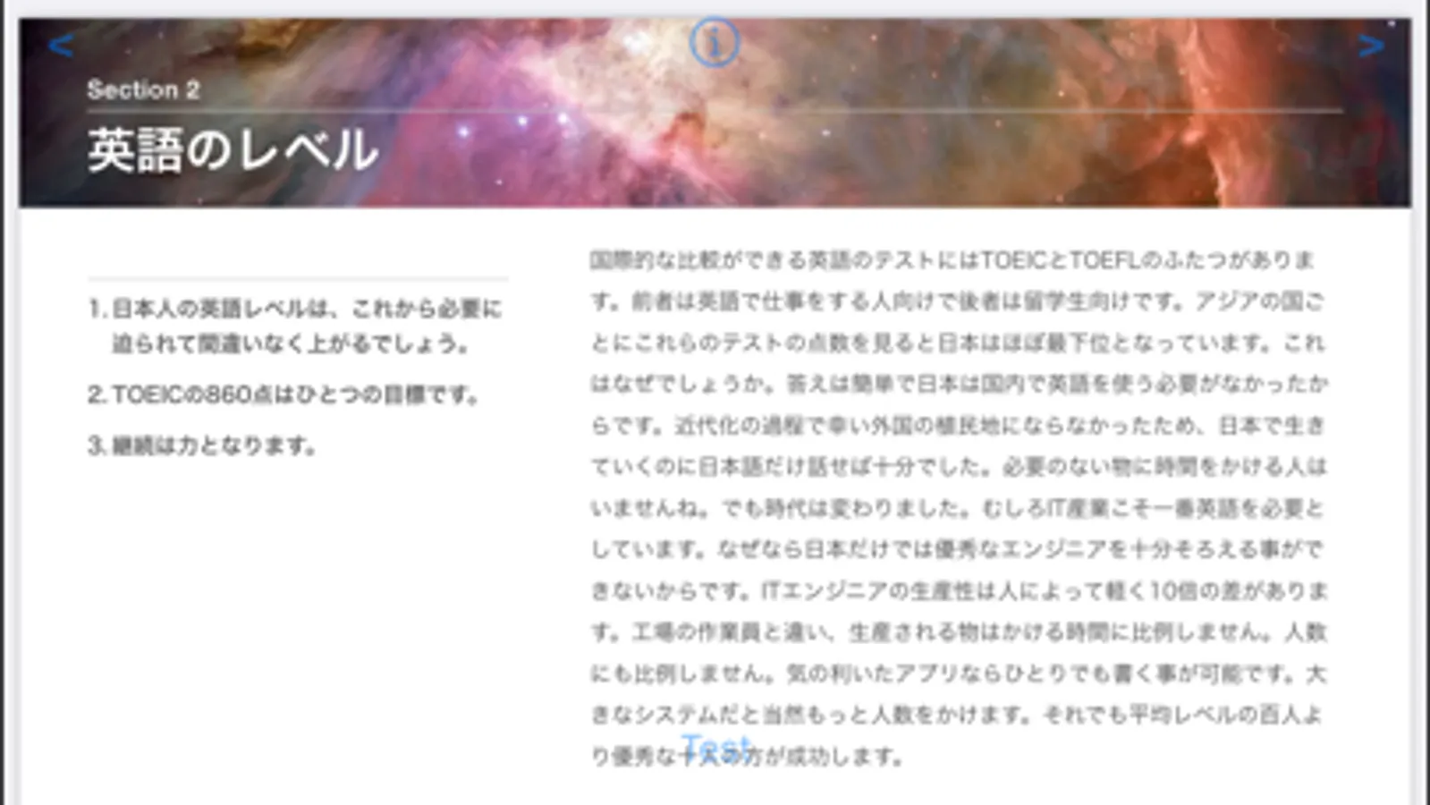 アメリカのシリコン・バレーで IT エンジニアを30年以上続けてきた筆者が、効果的な英語の練習方法をアプリで解説します。 日本語ができる人は英語も必ずできるようになります。 そのためには毎日の練習が大切です。 言葉は勉強するものではなくスポーツのように練習して上達するものです。このアプリで発音テストもできるので、すぐにダウンロードして「英語ができるエンジニア」を目指しましょう。