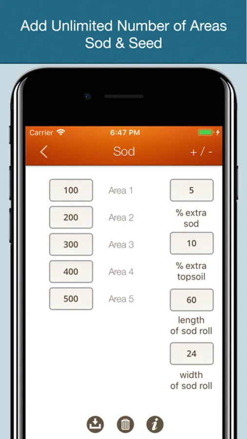 There is no limit to the number of areas you wish to input. This app is available in both imperial and metric units of measure.