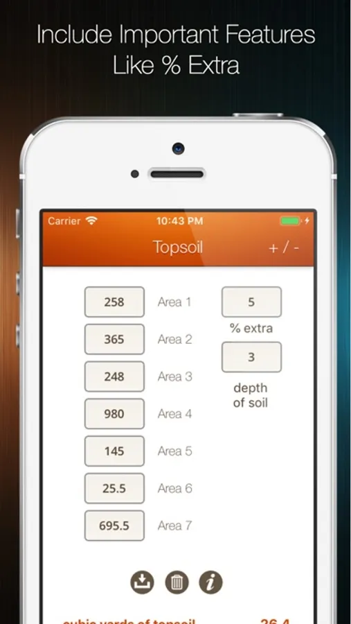 Our app also allows for extra. This is an important feature. Topsoil, is sold by volume (or weight) and is calculated in a uncompacted loose form. When you use it on your project, you'll most certainly want to pack it down some. The ability to include extra is a useful estimating procedure. Our app explains how to use this feature clearly.