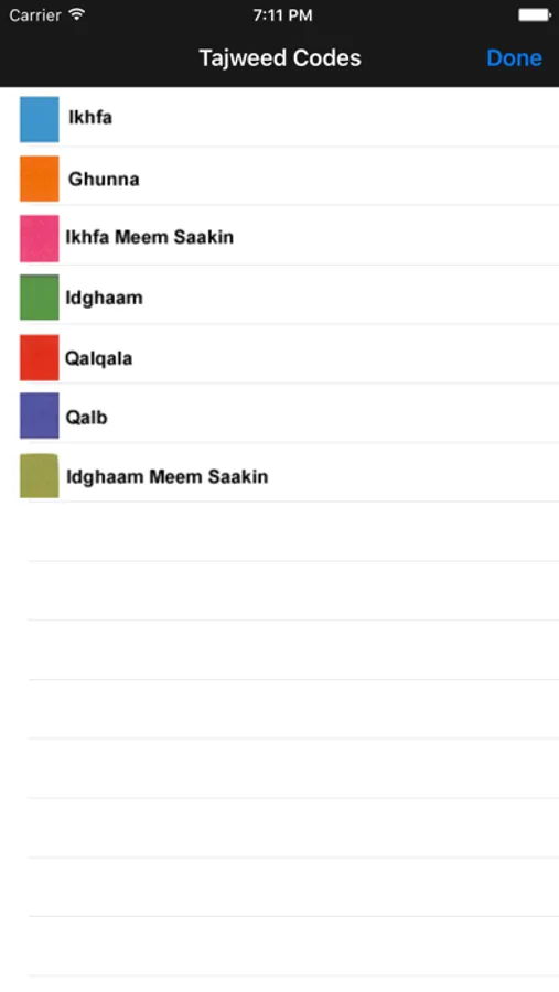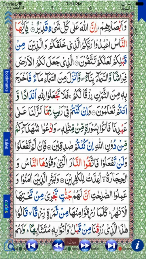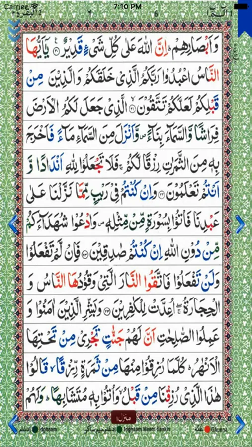 This application is very easy to use with simple easy to use arrows and cursors to browse and navigate throughout the whole Qur'an app. Color codes have been used throughout to distinguish all Tajweed rules. The reader can find out the definition of any Tajweed rule and clarification.