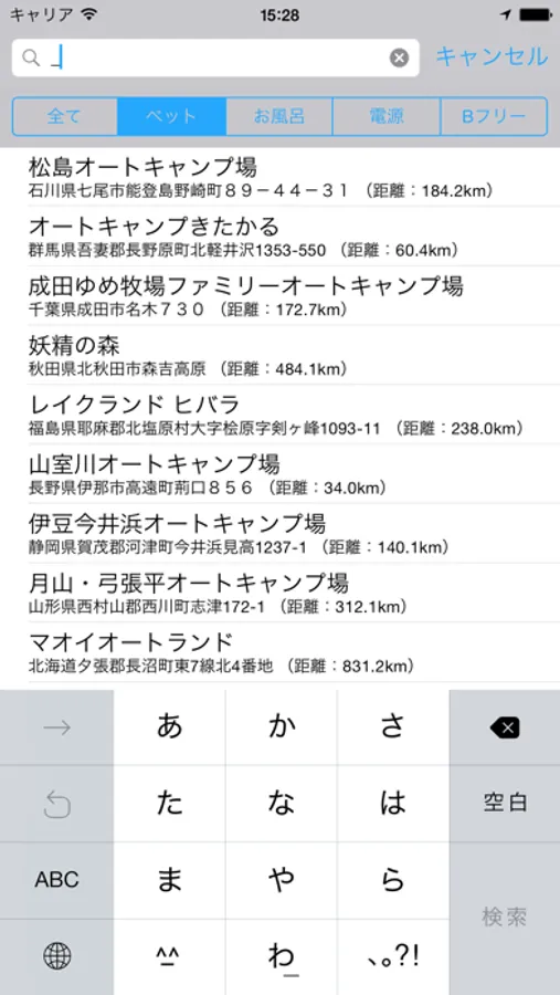 現在地周辺のオートキャンプ場を簡単な操作で探すことができ、キーワード、都道府県、施設条件から検索することもできます。
