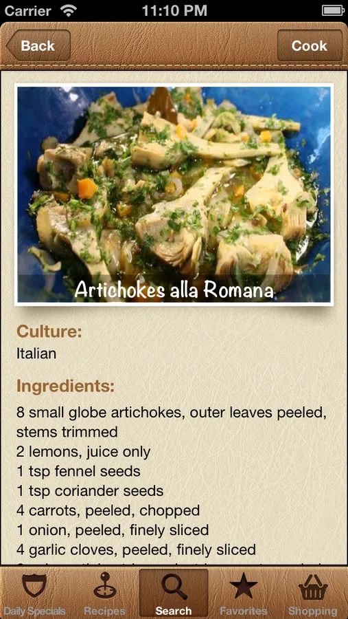 "Recipes" classifies the recipes from different countries and cultures: African, American, Caribbean, Chinese, East European, French, Greek, Indian, Italian, Japanese, Mexican, Middle Eastern, Northern Europe, South American, Southeast Asian, Spanish etc. Each recipe, you can view the details such as: culture, ingredients, method and tips.