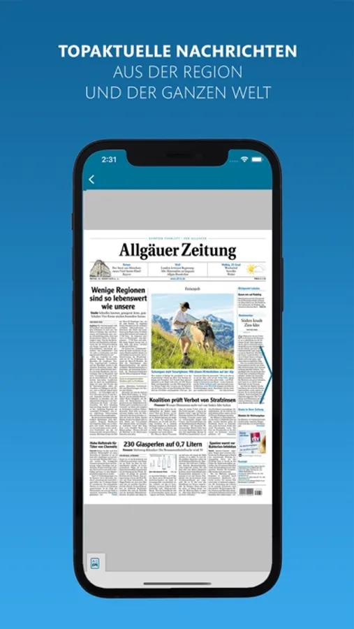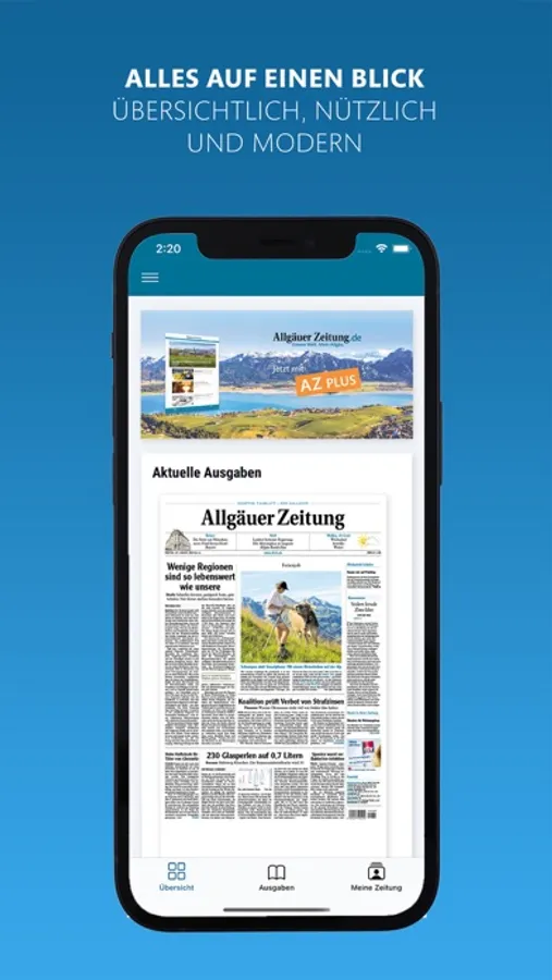 NEU: Lesen Sie bereits ab 19:30 Uhr die Zeitung von morgen in der Vorabendausgabe. Erfahren Sie einen Großteil der Neuigkeiten aus dem Allgäu, Deutschland und der ganzen Welt - exklusiv in der Allgäuer Zeitung App.