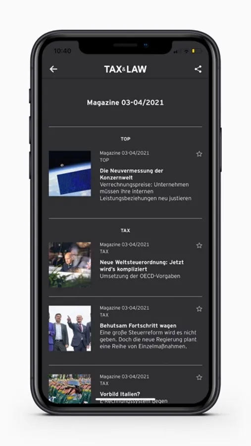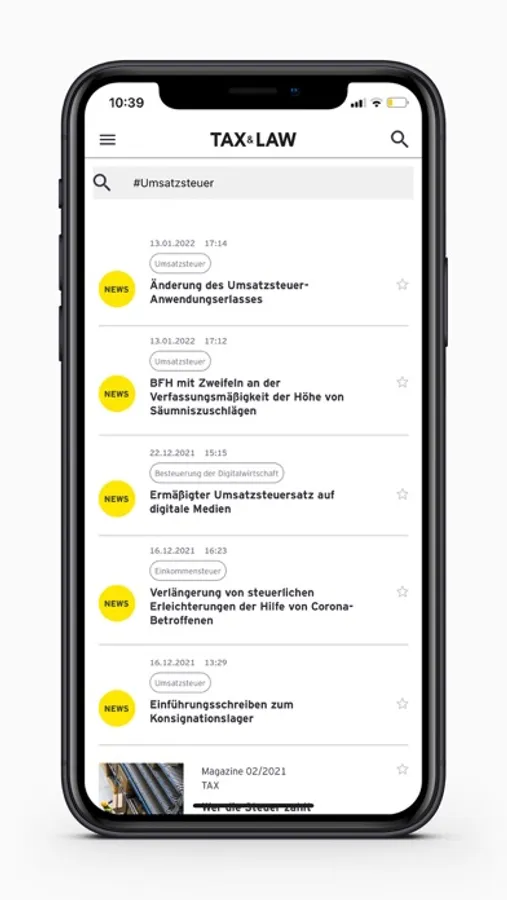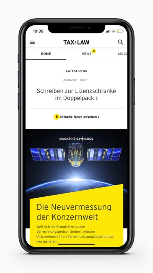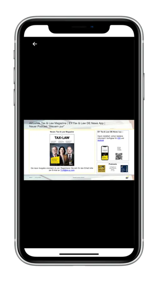 Die EY Tax & Law DE News App beinhaltet, zusätzlich zu aktuellen News, auch den Zugriff auf sämtliche Tax & Law Magazine mit fundierten Analysen und Business Cases rund um Steuern und unternehmensrechtliche Themen. Zum Hören für unterwegs bieten sich die EY Tax & Law Webcasts mit audio-visuell aufbereiteten Themenschwerpunkten an.