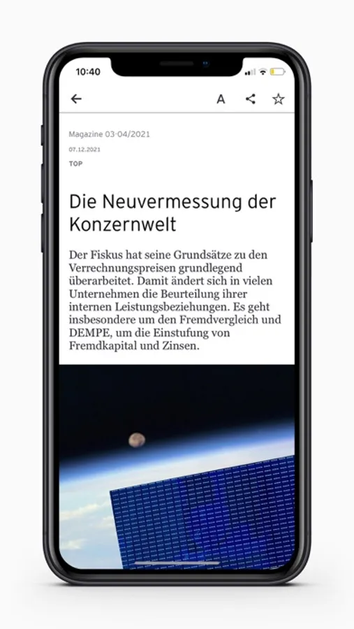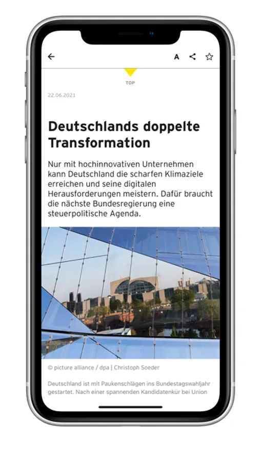Bei Steuern und Unternehmensrecht sind Sie mit der EY Tax & Law DE News App immer auf dem Laufenden. Ein Autorenteam, in einem Netzwerk von über 4.500 EY-Experten, bereitet alle wichtigen Neuigkeiten aus Gesetzgebung, Rechtsprechung und Finanzverwaltung auf – zeitnah, kompetent, verständlich.