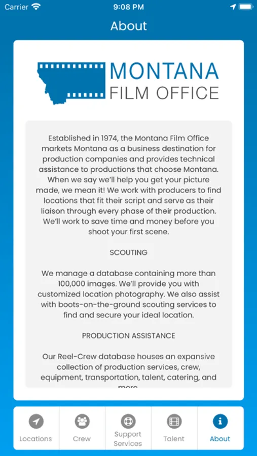 The Montana Film Office app is the ultimate film guide in the palm of your hand. Browse & Map locations by image, Contact Crew, Rent Equipment. That easy!