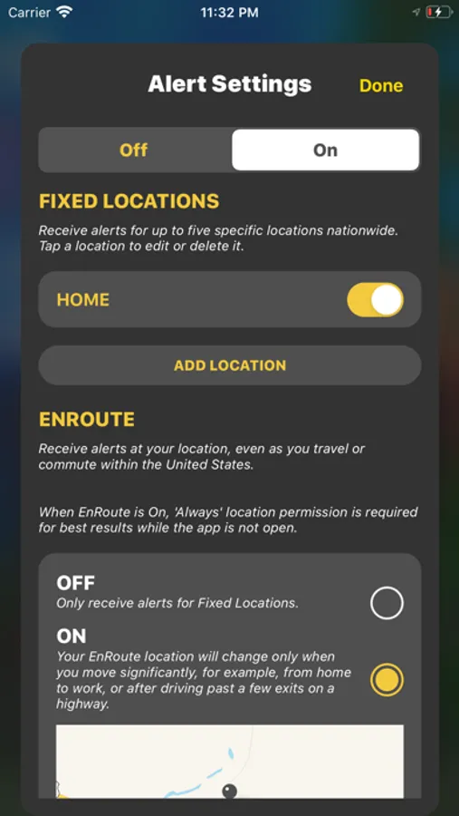 In addition to monitoring fixed locations, the “EnRoute” feature allows you to receive severe weather alerts while on the go! Simply enable EnRoute and the app will track your location and alert you if you drive into a warned area, whether you know your exact location or not!