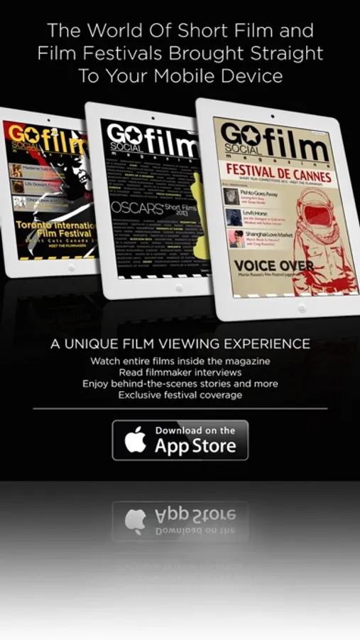 Published each month, Go Film Magazine delivers a completely unique reading and viewing experience to film lovers. The magazine allows subscribers to watch whole short films on the iPad or iPhone while also reading filmmaker interviews, interactive articles and behind the scenes info that explore the films’ production. Readers can interact with filmmakers right within the magazine via social media like Facebook.
