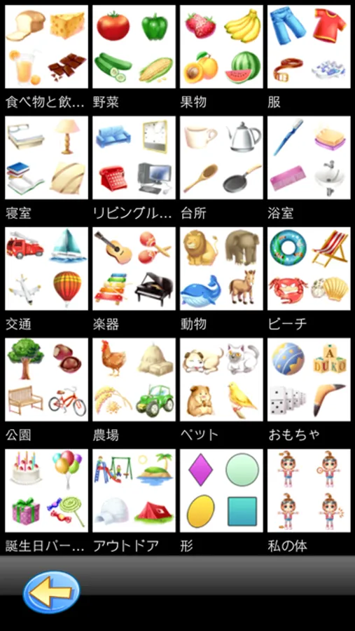 • 24 categories: Hiragana, Katakana, Colors, Shapes, Numbers, Body, Clothes, Animals, Farm, House, Park, Beach, Food, etc...