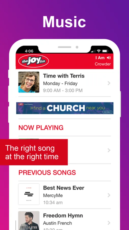 The JOY FM Georgia. Helping you find JOY wherever you go! Download the app now and hear Positive Uplifting Music from your favorite Christian artists. Get e-mail, text or Twitter alerts when your favorite songs are about to play and get in on the fun with Open Mic.  Find more JOY with our Praise, Classic and Lightforce music channels, too. Wake up to The JOY FM with our Alarm Clock feature and check weather and traffic. Thanks for downloading The JOY FM app, now you can listen to 93.3 The JOY FM everywhere you go!