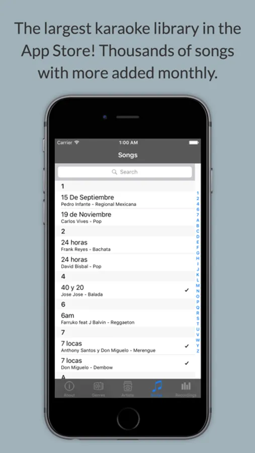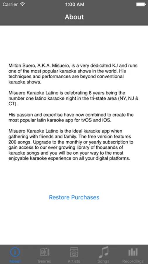 Misuero Karaoke Latino is the only app with thousands of songs! Get 200 songs for free or purchase the MKL Library monthly subscription for $0.99/month to get unlimited access to our ever growing library of Karaoke songs. You can also purchase the MKL Library yearly subscription for $9.99/year and save!