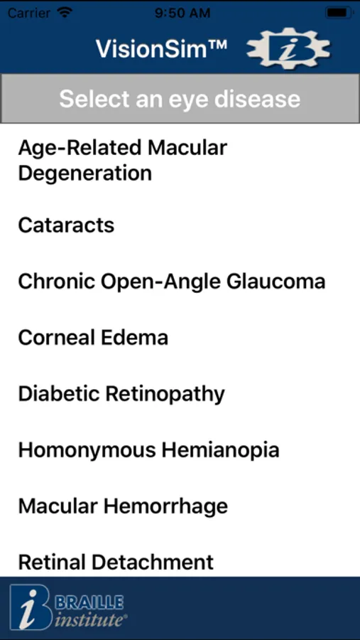 Braille Institute's VisionSim (v3.0) app for iPhone and iPad was developed to allow people with healthy vision to see the world through the eyes of a person experiencing one of nine degenerative eye diseases. The eye diseases that are simulated are: age-related macular degeneration, cataracts, chronic open-angle glaucoma, corneal edema, diabetic retinopathy, homonymous hemianopia, macular degeneration, retinal detachment, retinitis pigmentosa.