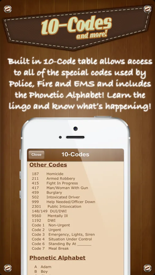 • 10-Codes by State allows access to all of the codes used by Police, Fire, Emergency and other radio band codes and other useful codes! Learn the lingo and know what’s happening as it happens!